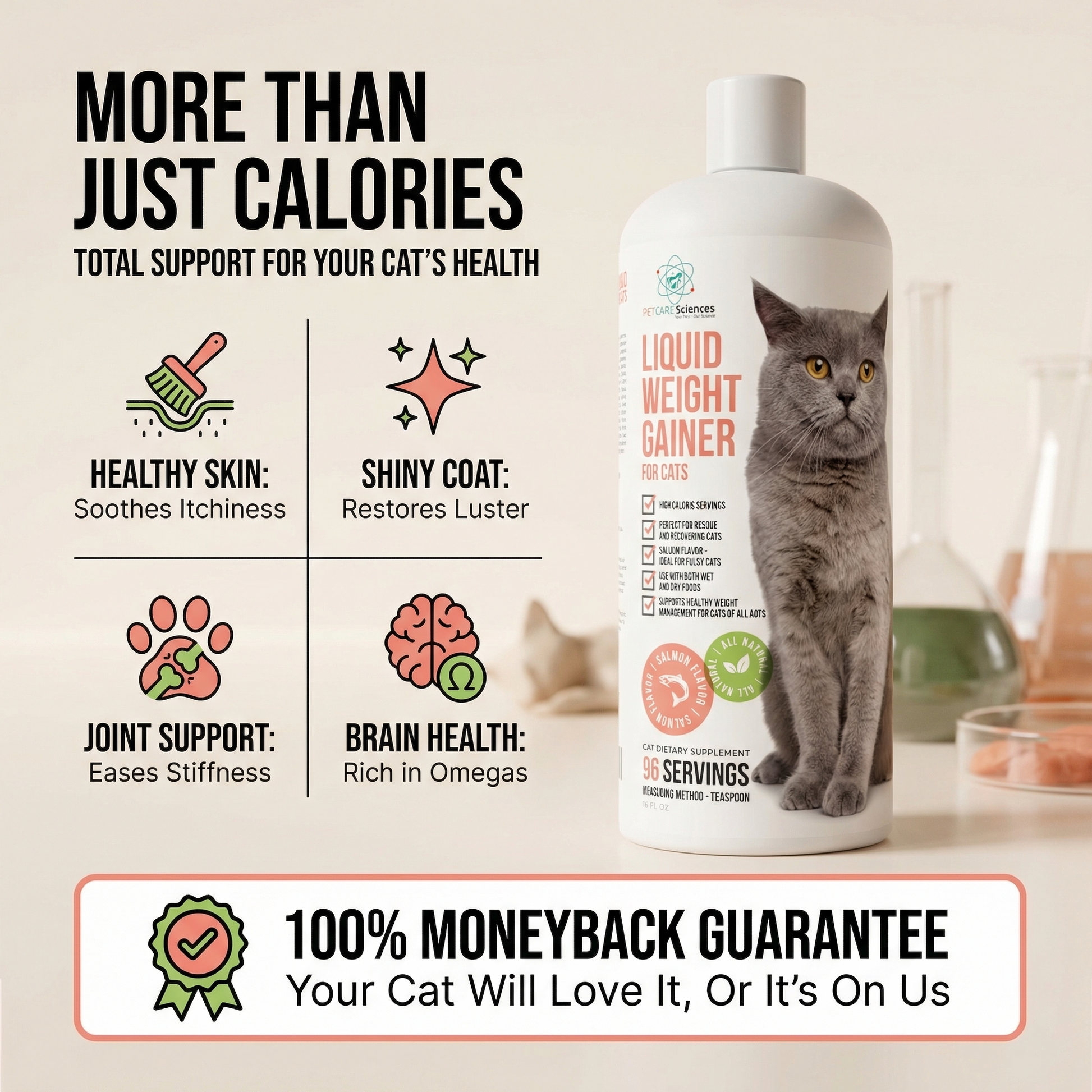- Salmon Oil - Not only will your cat love the taste, the included salmon oil packs a load of additional benefits. Rich in Omega 3 and 6 it is a quick and easy way to rehydrate your cat's coat and skin. Helping to reduce both itchy and dry skin. Our cat weight gainer is not only great for your pets coat, it will also reduce joint inflammation and help to support your pets immune system and brain health.
