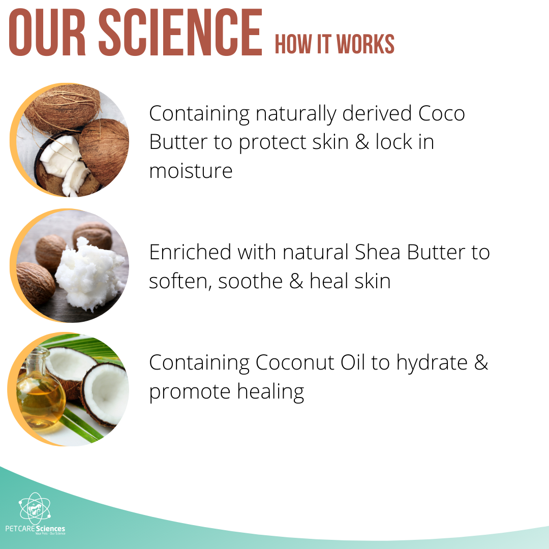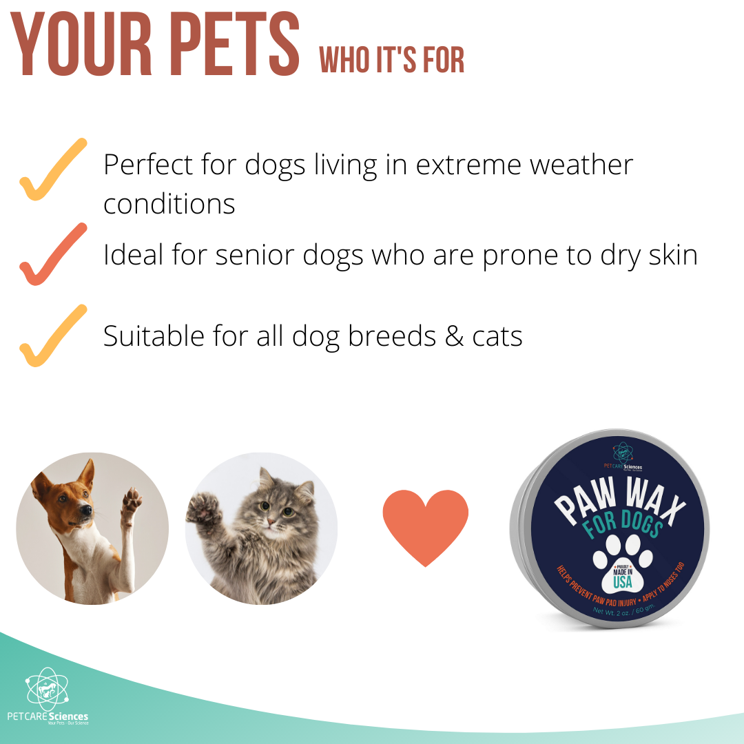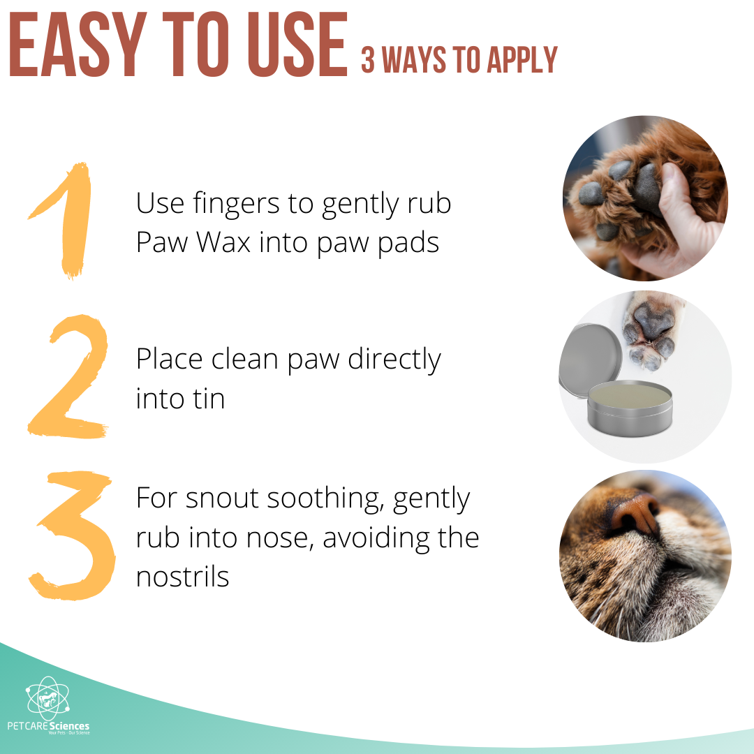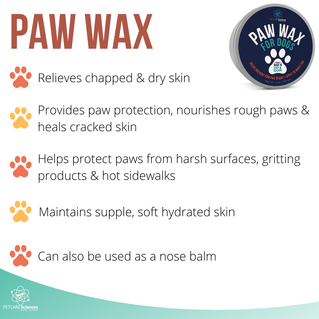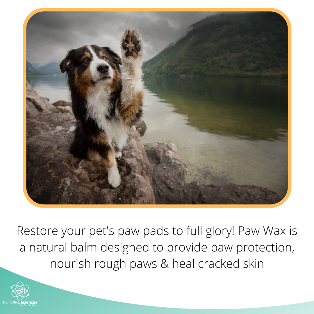 Introducing PET CARE Sciences Paw Wax! Our gentle and natural wax acts as a protective, preventative and healing balm. Paw Wax is specially formulated with coco butter and shea butter to nourish and sooth your pet’s paw pads and nose.Ideal for your dog, puppy or cat, Paw Wax is made with your pet’s health as our main concern.