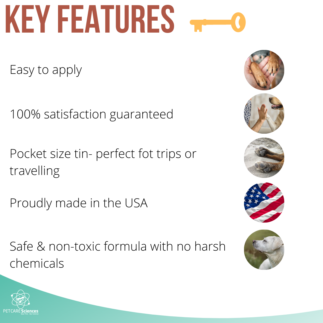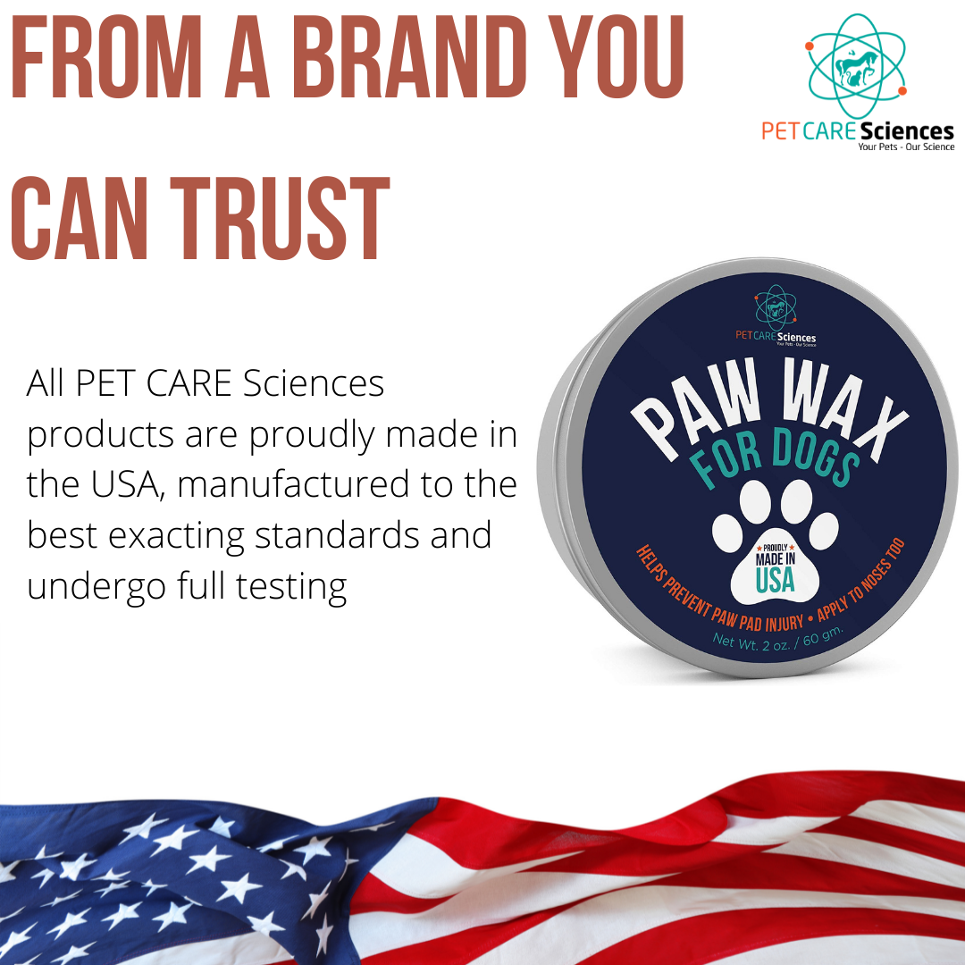 Paw Wax is proudly made in the USA, is manufactured to the best exacting US standards in regulated premises and undertakes full testing. PET CARE Sciences products are designed to assist in safely maintaining the health of your precious pets – we stake our reputation on it.