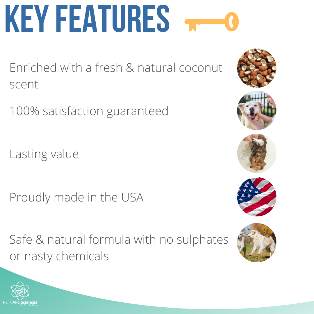 Deodorizes: Enriched with the wonderfully fresh, therapeutic scent of coconut, 5-in-1 ensures your dog smells great after each bath.